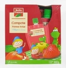 purée de pommes (67, 3%), purée de fraises (20%), sirop de glucose-fructose, purée de cassis, sucre, antioxydant : acide ascorbique
